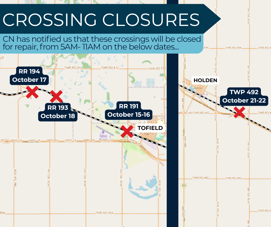 Heads up! CN have let us know they are getting some repairs done on the following crossings, these will be closed from 5-11AM on the dates listed: